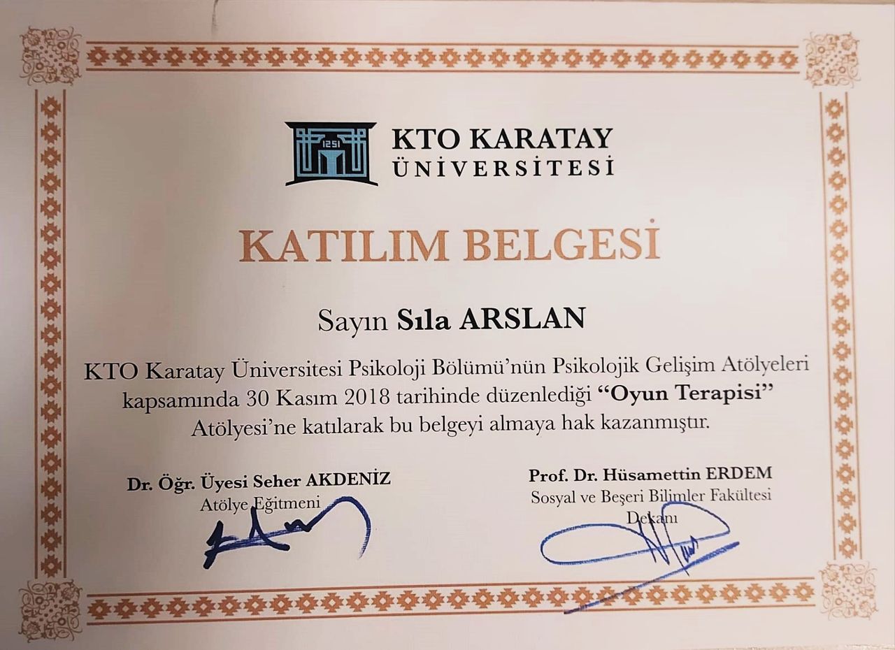 Oyun terapisi aldık. Oyun terapisinde gerek danışmanın gerekse veli ve aile bireylerinin yapması gerektiği sorumluluklar var. Bu sorumluluklar yerine getirildiği müddetçe psikoterapist Sıla hanım harikalar üretiyor. Hedefe kararlılıkla yürüdüğü için ve tüm özverisi için kendisine şükranlarımı sunar, başarılarının devamını dilerim.